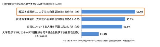 必要性を感じる理由については、1位「就活本番期前に大学生の自社認知度を高めたい」(68.4%)、2位「就活本番期前に大学生の自業界認知度を高めたい」(55.7%)、3位「自社にフィットする人材を早期に見つけたい」(51.9%)でした。【図2】 一方で、必要性を感じない理由は、「対応できるリソースが足りない」「接点を持ち続けることが難しい」など採用側のリソース不足、「接点を持っても考え方が変わる」「就活の方向性が見えていない学生が多い」などキャリア感が身についていないことによる思考の不確実さを懸念する声が多く上げられました。