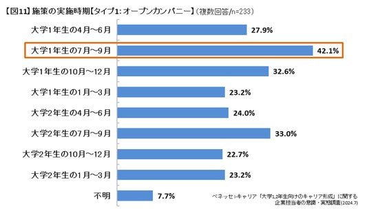 実施(予定)時期については、「タイプ1:オープンカンパニー」「タイプ2:キャリア教育」ともに、「大学1年生の7~9月」が最多となりました。【図11,12】