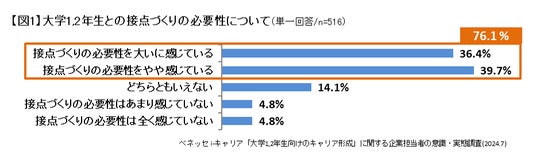 企業の中で大学生の新卒採用担当者、及び同業務に従事する現場担当者を対象に、キャリア形成に関わる施策を通じた「大学1,2年生との接点づくり」の必要性について聞いたところ、「必要性を大いに感じる」(36.4%)と「必要性をやや感じる」(39.7%)の回答合計が76.1%となりました。【図1】