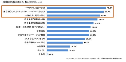 ・実施における課題感や悩みは、1位「プログラム内容の設計」(40.3%)、2位「運営面(マンパワー不足)」(38.8%)、3位「実施時期、期間の設定」(36.0%)
