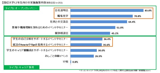 具体的な実施(予定)施策内容については、「タイプ1:オープンカンパニー」は1位「会社説明会」(83.0%)、2位「職場見学」(70.8%)、「タイプ2:キャリア教育」は1位「学生の自己分析をサポートするイベントやセミナー」(36.4%)、2位「就活のhow toやTipsを指南するイベントやセミナー」(35.6%)となりました。【図5】