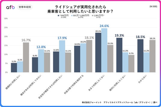 世帯年収別で見ると、世帯年収が「~500万円」や「501万~1,000万円」の層ではライドシェアの利用に慎重な回答をした方が多かったのに対して、「1,001万円~」の層では「積極的に利用したい」と回答した方が16.7%と10%以上の差をつける結果となりました。たとえ割高であっても移動時間が短縮できるのであれば、支出を厭わない傾向にあることが推察されます。また、単に移動手段としてだけでなく、「新しいサービスを体験する」という「経験」そのものに価値を見出している可能性も考えられました。