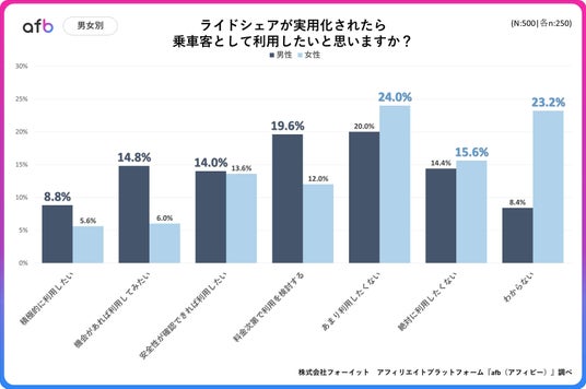男女別で見ると、「積極的に利用したい」や「機会があれば利用してみたい」などの回答をした方は男性が多かったのに対して、「利用したくない」や「わからない」と回答した方は女性が多く、男性の方がライドシェアの利用にポジティブな傾向があることが分かりました。日本では「知らない人の車に乗る」という行為自体の心理的ハードルが高く、とりわけ女性の場合は犯罪やセクハラ被害などを懸念する方が多いと考えられます。通常のタクシーであればきちんと会社に登録されていたり、防犯カメラが設置されていたりするため、わざわざライドシェアを利用したいという女性は少ないことが推察されます。しかし、「安全性が確認できれば利用したい」と回答した女性も13.6%いることから、安全面での懸念が解消されれば利用する女性は多いのかもしれません。