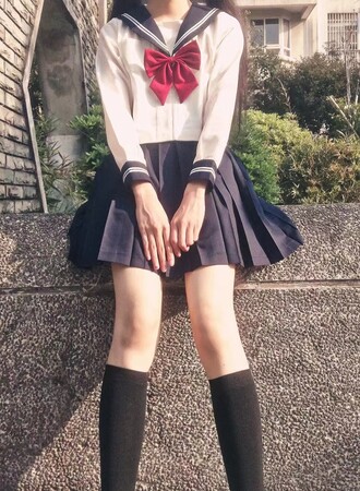 ブラウス・スカート・リボン・ソックスの4点がセットになったセーラー服。ショート丈のスカートとハイソックスがスタイルアップを実現。