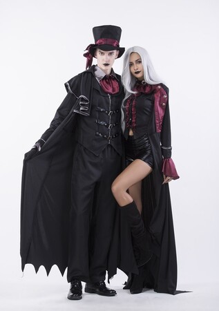 スタイリッシュなドラキュラコーデが目を惹くこと間違いなしのコスチューム。男性用と女性用があり、カップルでも楽しめる。