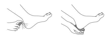 かかとにプレフットケアローションを約3プッシュ吹きかけ、かかとの角質に浸透させます。