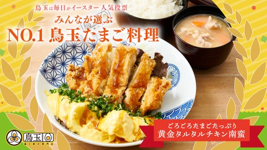 株式会社串カツ田中ホールディングスの子会社、株式会社セカンドアロー(本社:東京都品川区東五反田、代表取締役社長:大須賀 伸博 以下、セカンドアロー)が展開する「鳥と卵の専門店 鳥玉」(以下、鳥玉)は、3月29日(金)~4月7日(日)にかけて「投票イースター」(※1)を実施しました。多くの方にご投票いただいた結果、鳥玉名物の「ごろごろたまごたっぷり 黄金タルタルチキン南蛮」が1位を獲得し、5月13日(月)~20日(月)の期間限定で、通常価格が税抜980円(税込価格1,078円)の定食セットを、特別価格の税抜780円(税込価格858円)で販売いたします。