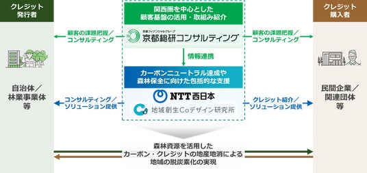 3社が連携することで、地方公共団体や民間企業の森林管理に関する課題把握や伴走支援を行うとと もに、京都総研コンサルティングの顧客基盤における、カーボン・オフセット活用ニーズを有する民間企業等やカーボン・クレジット創出ニーズを有する地方公共団体等に対して、NTT西日本および地域創生Coデザイン研究所がソリューションやコンサルティング※2の提供を通じた支援を行うことにより、カーボン・クレジットの地産地消を進めてまいります。