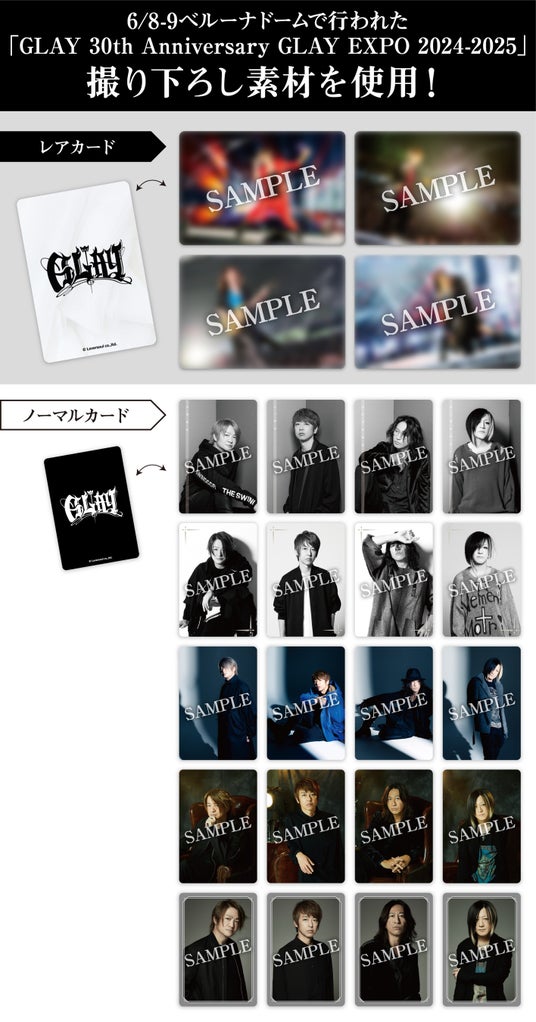 カードはレアカード4種、ノーマルカード20種の計24種。レアカードは先日行われたベルーナドーム公演のライブカットを使用し、さらにGLAYメンバーの複製サイン入りとなります。レアカードの絵柄については発売後のお楽しみに!