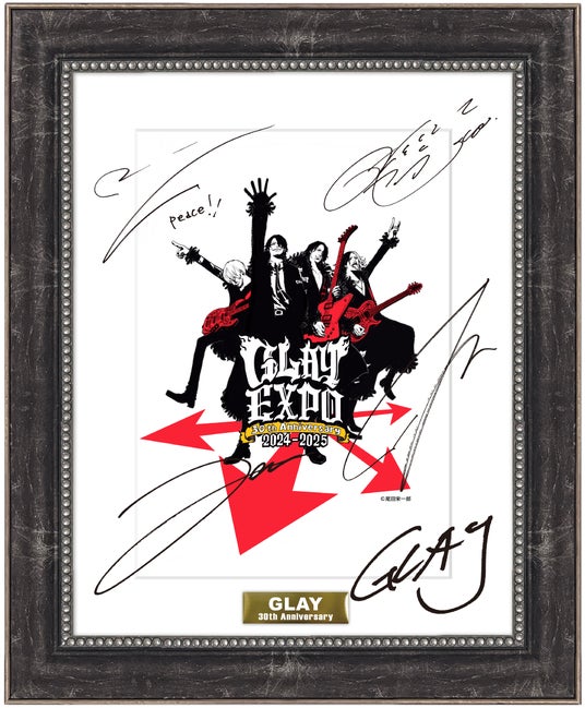 尾田栄一郎さんが手掛けた30周年を象徴するキービジュアルのイラストを使用したキャラファイングラフで、GLAYメンバーの複製サイン入りとなります。額縁、プレート付きで飾れる記念品としておすすめです。