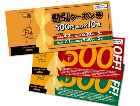 有効期限の異なる2種類の500円OFFクーポン券が、10枚綴りで1冊になっています。他の割引・サービス(JAFや子育て優待を含む)クーポン券との併用も可能で、いつもよりワンランク上のお食事をお得にご利用いただけます。