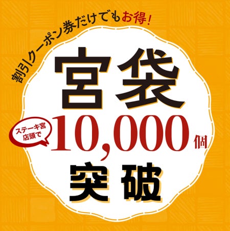 ステーキ宮が、2025年に迎える創業50周年に向けて、皆様への感謝の気持ちを込めて販売しております「宮袋」ですが、おかげさまで予想を上回る反響を頂いております。さらに多くのお客様に喜んで頂けるよう割引クーポン券を増刷して販売いたします!宮袋“割引クーポン券だけでもお得!“な内容になっており、全国のステーキ宮でお使いいただける「割引クーポン券5,000円分」と、「創業以来愛され続ける秘伝のたれ!宮のたれ500g1本」を、3,300円(税込)でお買い求めいただけます。