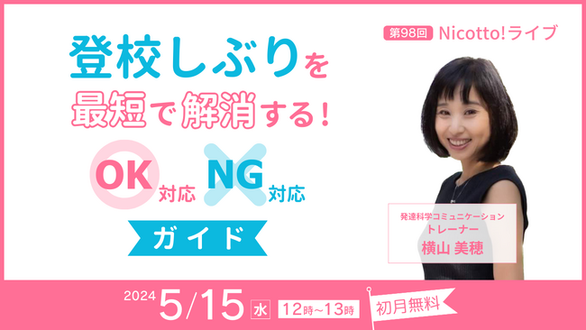 株)パステルコミュニケーション(本社:東京都豊島区、代表取締役:吉野加容子)が運営する、発達障害・グレーゾーンの子どもを育てるママがいつでも学べて相談できる月額制会員サイトNicotto!塾は、5月15日(水)12−13時に「登校しぶりを最短で解消する!ママのOK対応/NG対応ガイド」オンラインライブを開催いたします。 〈https://desc-lab.com/nicotto202201/?prt0509〉