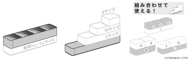 また、上記のカトラリートレーと同じサイズでぴったり重ねて使える「整理トレー NブランLL」も新発売しました。LLサイズは幅が34cmあるので、菜箸などを入れるのに適したサイズです。「整理トレー Nブラン」シリーズのサイズ違い(S、M、Lサイズ)と組み合わせてお使いいただけます。