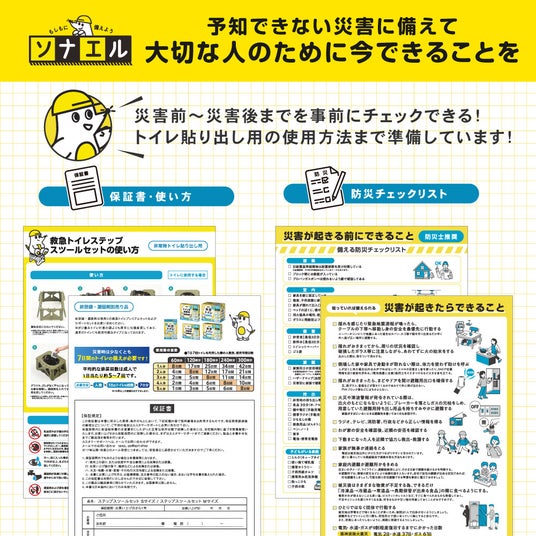 【セット内容】本体、収納バッグ、排泄袋6枚、凝固剤6個、取扱説明書(2枚)、防災チェックリスト(1枚)