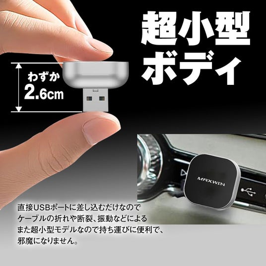 わずか2.3センチの超小型ボディで邪魔にならずスマートに取り付けが可能です。長細いスティックタイプやケーブル付きのモデルに比べ、本体やケーブルの折れを防ぎ、車内インテリアにも影響ありません。