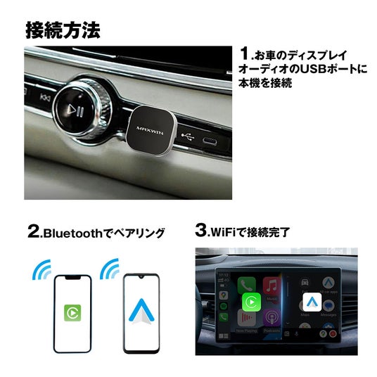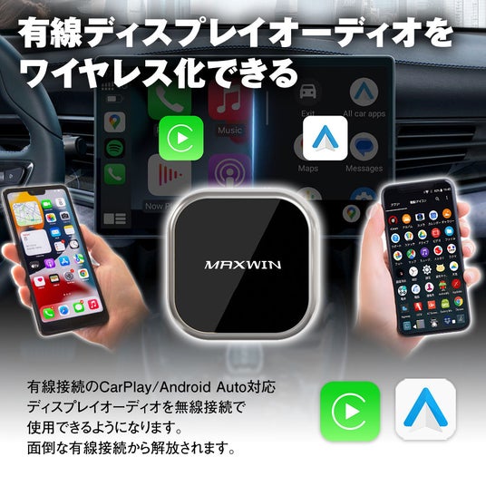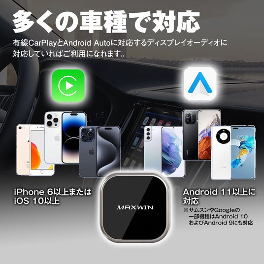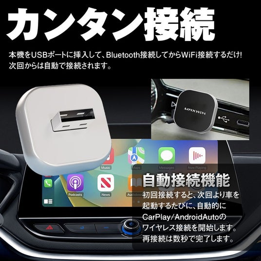 有線接続のCarPlay/Android Auto対応ディスプレイオーディオを無線接続で使用できるようになります。面倒な有線接続を解消できます。