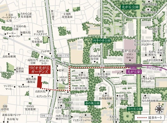 「光が丘」駅周辺には、「光が丘公園」を中心に、計画的に整備された街並みと豊かな自然が共存する、潤い溢れる住環境が形成されています。『リビオ光が丘ガーデンズ』は、街の環境との調和を目指し、「緑とのふれあい」や「子育て」などを意識したさまざまな施策を取り入れた集合住宅です。