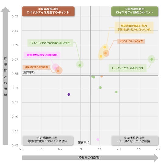 一方で、ロイヤルティを向上させるために優先的に改善すべき項目としては、「マイページやアプリでの取引のしやすさ」や「資産運用に対する期待通りの成果」、「お客様に寄り添う姿勢・大切にする姿勢」となりました。