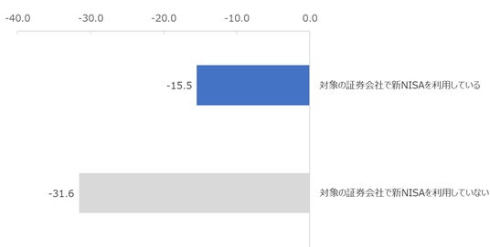 ネット証券について、新NISAの利用状況別にNPSを分析したところ、対象の証券会社で新NISAを利用している人のNPSは-15.5ポイントとなり、それ以外の人と比べて高い傾向がみられました。また、対面証券においても同様の結果となりました。