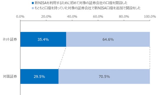 対象の証券会社で新NISAを利用している人に対し、新NISAの口座開設の仕方を調査したところ、ネット証券において「新NISAを利用するために初めて対象の証券会社の口座を開設した」人は35.4%、「もともと口座を持っていた対象の証券会社で新NISA口座を追加で開設をした」人は64.6%となりました。また、事業種別に分析したところ、「新NISAを利用するために初めて対象の証券会社の口座を開設した」人の割合はネット証券のほうが対面証券よりもやや高くなりました。