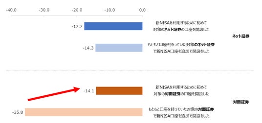 さらに、新NISAの口座開設の仕方別にNPSを分析したところ、ネット証券において「新NISAを利用するために初めて対象の証券会社の口座を開設した」人と「もともと口座を持っていた対象の証券会社で新NISA口座を追加で開設をした」人でNPSの大きな違いはみられませんでした。一方で、対面証券においては「新NISAを利用するために初めて対象の証券会社の口座を開設した」人のほうがNPSが高くなり、ネット証券と対面証券で傾向に違いがみられました。