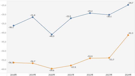 図:ネット証券全体と対面証券全体のNPSの経年推移