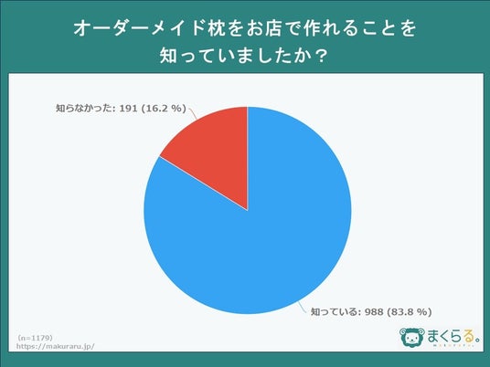 実態を知るため「オーダーメイド枕をお店で作れることを知っていましたか?」というアンケート調査(n=1179)を行ったところ、83.8%の人が「知っている」と回答。店舗でオーダーメイド枕を作れることが広く認知されていることがわかりました。