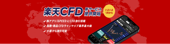 楽天証券株式会社(本社:東京都港区、代表取締役社長:楠 雄治、以下「楽天証券」)は、本日、2023年1月30日(月)より、「楽天CFD」のサービスを開始し、楽天証券のオリジナルスマートフォン向け株式トレーディングアプリ「iSPEED(R)」にCFD取引機能を追加したことをお知らせします。