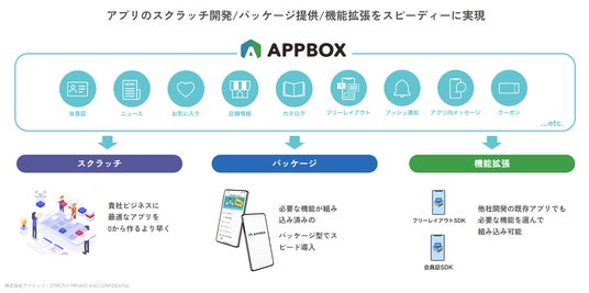 「APPBOX」は、アプリで使う各種機能群を組み合わせることで、ゼロからのアプリ開発や既存アプリの機能拡張、マーケティング施策まで、アプリビジネスに必要なすべてを支援するプラットフォームです。他社で開発したアプリの機能拡張にも活用でき、また、各種他社ツールとの連携も柔軟に行えるのが特長です。小売企業などの会員システムを導入している企業や、基幹システムとの連携が必要な企業にも対応可能です。