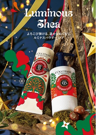 ホリデーコレクションの最後を飾る第3弾「ルミナスパウダー シア」シリーズは、やさしくパウダリーな木の温もりが、ふんわり包みこむような限定の香り。乾燥する季節にぴったりの穏やかにボディを洗い上げるシャワークリーム、ワンプッシュで潤いをとどけるボディローション、淡雪のような感触で肌に溶けるふわふわのハンドクリーム、冬の唇にさっとひと塗りでツヤと潤いを与えるリップバームなど、幸せな香りをたのしめる笑顔あふれるラインナップ。