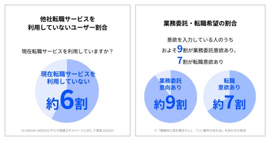当社がビザスクに登録するエキスパートを対象に行った調査では、約6割が「現在、転職サービスを利用していない」と回答しました。一方で、業務委託での活動に前向きな方が約9割、正社員転職の意欲を持つ方は約7割という結果も出ており、「転職市場には出てきていないが、知見を活かして新しいチャレンジをしたい」人材が多く含まれていることが分かります。こうした転職潜在層に対して、アプローチできることが「ビザスクdirect」ならではの強みです。