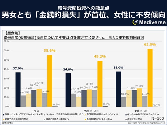 男女別に見ると、暗号資産(仮想通貨)投資への懸念点は、男女とも「金銭的損失リスクが怖い」が首位となっており、特に女性の6割以上が回答していた。