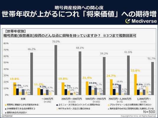 なお、「よくニュースで見るビットコインに興味がある(14.6%)」と「ブロックチェーンなどの新技術に触れてみたい(8.7%)」がもっとも高い比率だったのは世帯年収500万円~700万円、「24時間取引できる点が便利そう(16.4%)」は世帯年収700万円~1,000万円、「NFTやメタバースなどに関心がある(13.8%)」は世帯年収1,000万円以上となっており、どの世帯年収層でも将来価値への期待を首位としながら、2位以下の関心項目は世帯年収層により異なっていた。
