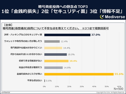 暗号資産(仮想通貨)投資の不安な点を聞いてみたところ、「金銭的損失のリスクが怖い」が圧倒的に多く、過半数を占めていた。