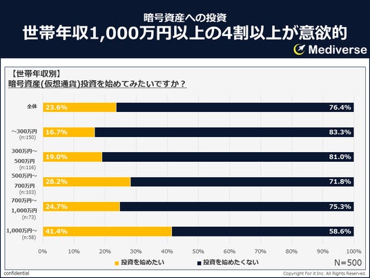 世帯年収別に見ると、暗号資産(仮想通貨)への投資意欲は、世帯年収1,000万円以上の世帯年収層の4割以上(41.4%)となっており、世帯年収300万円未満の世帯年収層(16.7%)と比べて、約2.5倍の差があることが見てとれる。