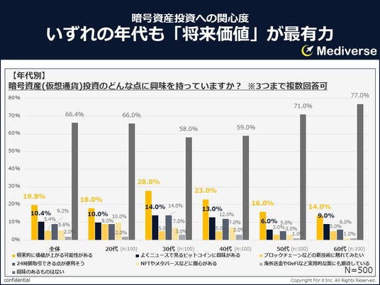 年代別に見ると、暗号資産(仮想通貨)投資への関心度は、いずれの年代も「興味があるものはない」が最多であるものの、次点には「将来的に価値が上がる可能性がある」点を挙げていた。