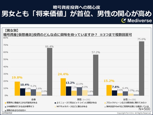 その一方で、興味のある点については、男女とも「将来的に価値が上がる可能性がある」ことが首位となっており、その他の回答においても、いずれも男性は女性の2倍前後という結果が出ており、男性の方が女性に比べて、暗号資産(仮想通貨)投資への関心が高いことが垣間見える。