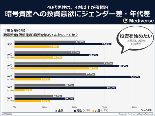 男女年代別に見ると、暗号資産(仮想通貨)への投資意欲には、全く異なる傾向が見られた。