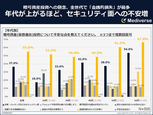 年代別に見ると、暗号資産(仮想通貨)投資への懸念点は、すべての世代において「金銭的損失リスクが怖い」が最多となっており、とりわけ60代においては7割近い回答率(67.0%)となっていた。