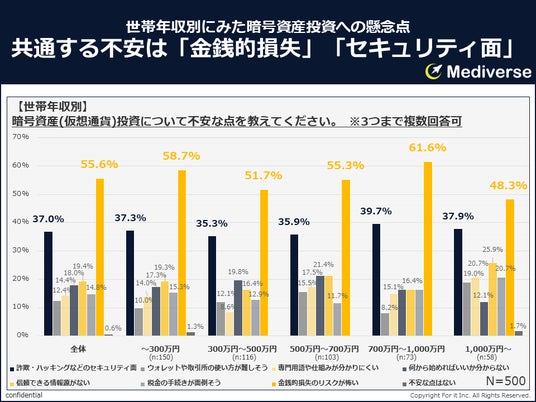さらに、この2つの比率がもっとも高かったのは、いずれも世帯年収700万円~1,000万円の世帯年収層であり、「金銭的損失リスクが怖い」は6割を超え、「詐欺・ハッキングなどのセキュリティ面」が約4割に達していた。