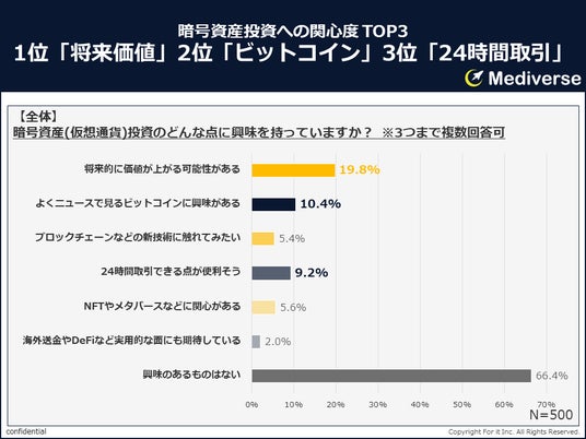 暗号資産(仮想通貨)投資のどんな点に興味を持っているか聞いてみたところ、もっとも多かったのは「興味のあるものはない(66.4%)」であり、その後「将来的に価値が上がる可能性がある(19.8%)」、「よくニュースで見るビットコインに興味がある(10.4%)」、「24時間取引できる点が便利そう(9.2%)」が続いた。