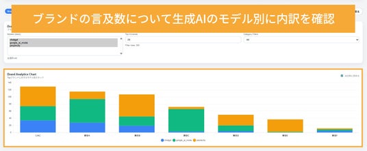 こうした前提を踏まえ、現場のコンサルタントからのフィードバックを基に、生成AIの回答データを集計し、ブランドの言及数をモデル別・カテゴリ別にグラフで確認できる機能を新たに開発、実装しました。