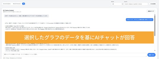 データの解釈に迷った場合は、AIチャットと対話しながら分析を進めることも可能です。分析したいグラフを選択したうえで、「モデルごとの傾向の違いを教えてください」などと質問すると、AIチャットがデータを基に回答します。