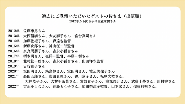 これまで吉永小百合、山田洋次監督、吉行和子、北村総一朗、奈良岡朋子、半藤一利など多くの映画人の方が映画祭に登壇し、上映とトークショーをセットにした映画祭を開催してきました。