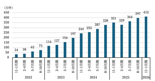 ・2026年1Q(2025年11月-2026年1月期)の全国のスポットワーク募集件数は412.1万件(前年同期比+17.4%)