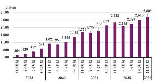 ・2026年1Q(2025年11月-2026年1月期)の延べ総労働時間(稼働実績)は2,809万時間(前年同期比+15.5%)