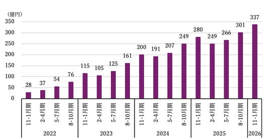 ・2026年1Q(2025年11月-2026年1月期)の総賃金額(実績)は337億円(前年同期比+20.3%)