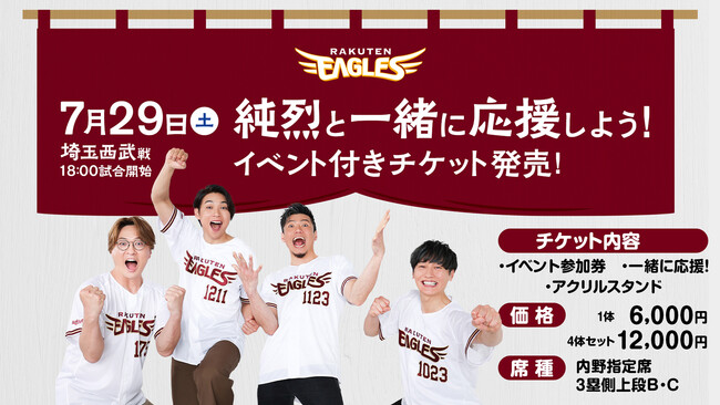 株式会社楽天野球団(本社:宮城県仙台市宮城野区、代表取締役社長:米田 陽介)は、7月29日(土)埼玉西武ライオンズ戦において、純烈の皆さんにご登場いただくこととなりましたので、お知らせいたします。