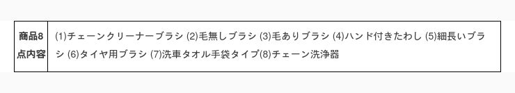 自転車やバイクの洗車に便利な洗車道具8点セットです。ギア、チェーン、スプロケット、ブレーキ、ペダル、その他のコンポーネントの掃除がスムーズにできます。